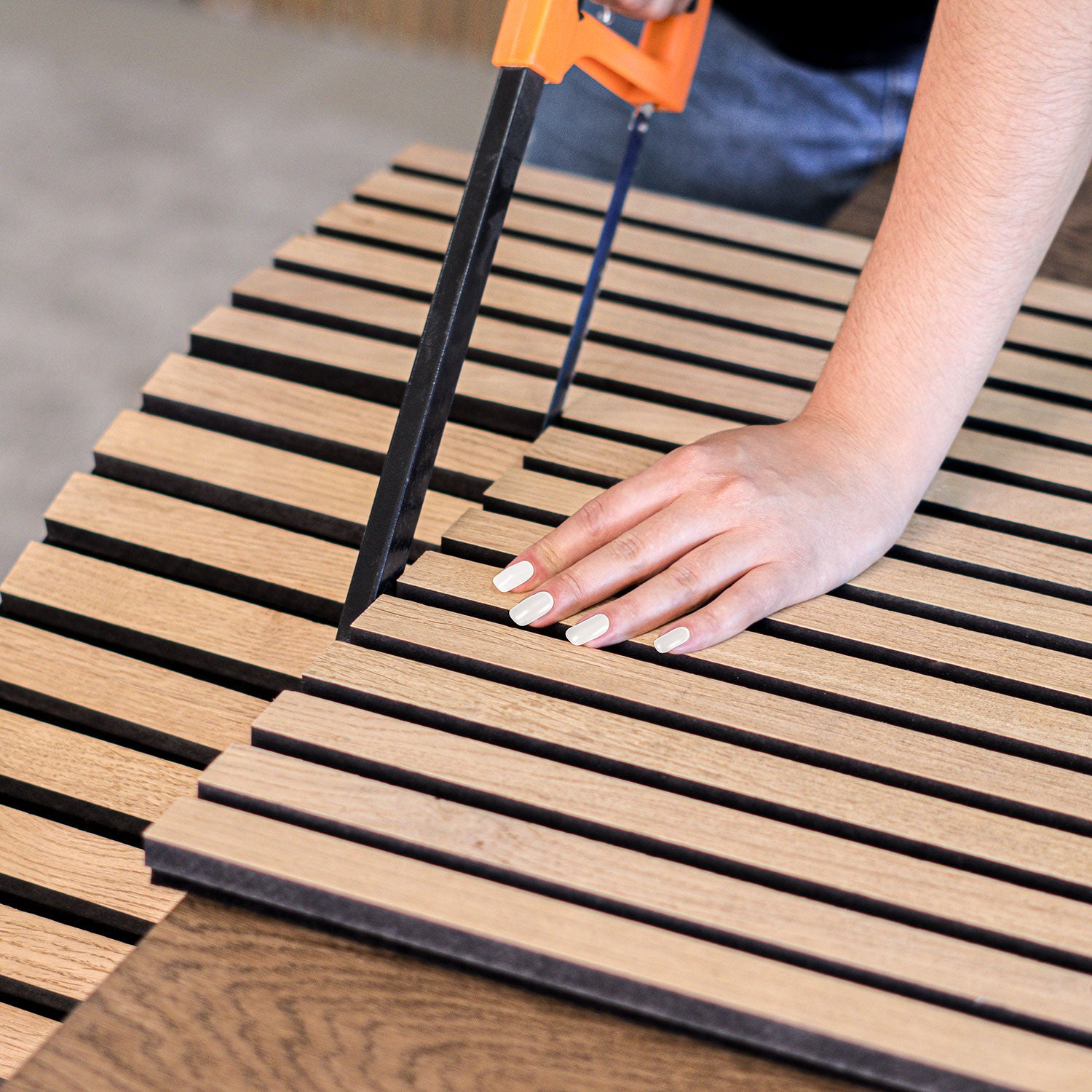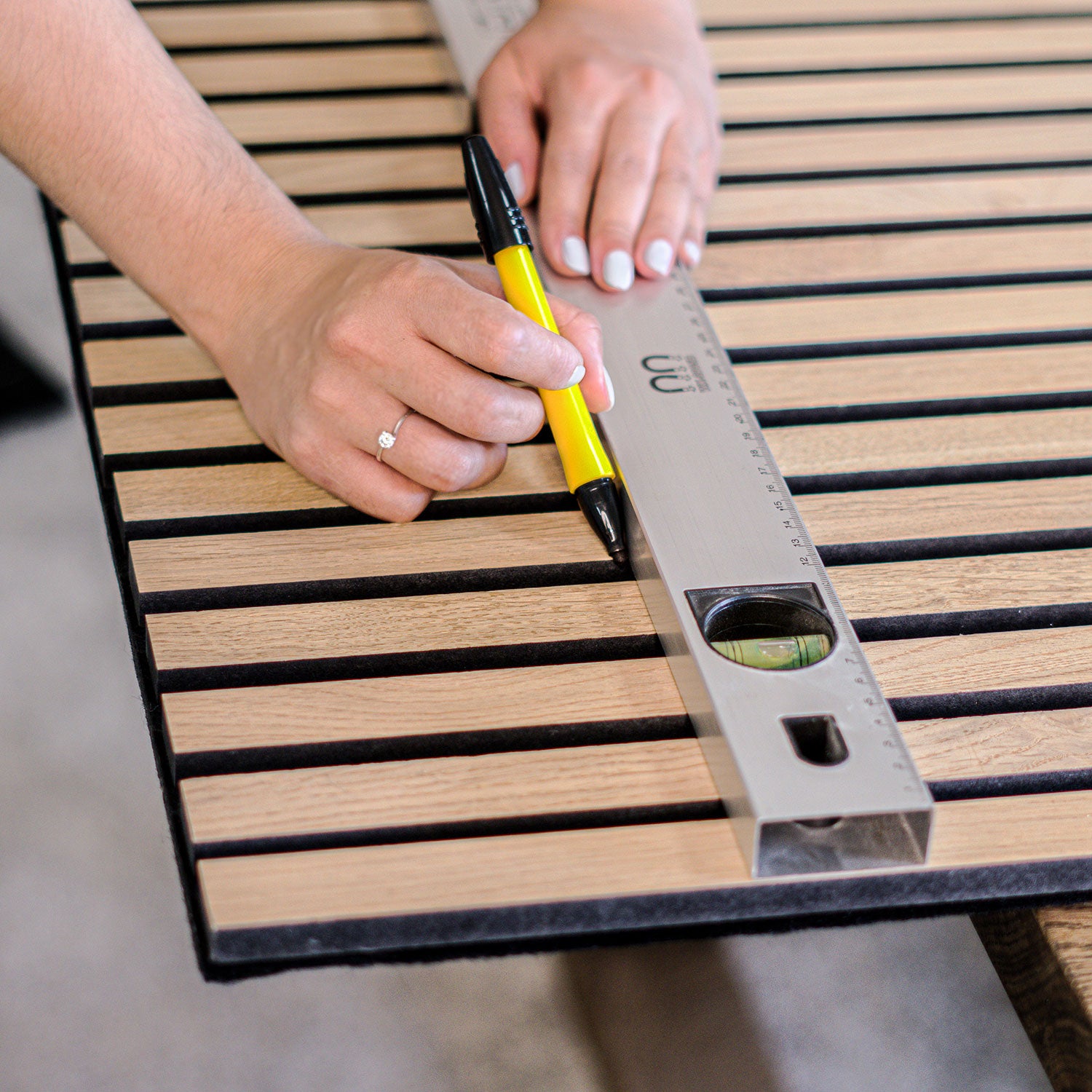 Die Walleu-Akustikpaneele besteht aus 15 Lamellen, die in gleichmäßigen Abständen von 13mm verteilt sind und alle auf einem 9mm dicken Akustikfilz angebracht sind.